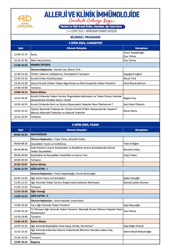 Türkiye Ulusal Allerji ve Klinik İmmünoloji Derneği tarafından hazırlanan “Alerji ve İmmünolojide Gençlerle Geleceğe Doğru: Yönetimi Zor Üçlü: Kronik Ürtiker, Anjioödem ve Ağır Astım Kursu” 5-6 Ekim 2024 tarihinde Wyndam Grand Kayseri Otel’de gerçekleştirilecektir.